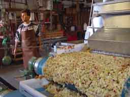 Andreas überwacht den Pressvorgang, auf dem Pressband das fischgemahlene